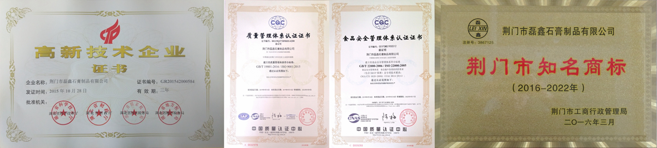 國家高新技術(shù)企業(yè)!湖北省專精特新中小企業(yè)!湖北省支柱產(chǎn)業(yè)細分領域隱形冠軍培育企業(yè)!湖北省守合同重信用企業(yè)!湖北省兩化融合示范企業(yè)!荊門市知名商標!中國高純、高白、高亮、超細硫酸鈣(石膏)生產(chǎn)基地!中國取得《食品生產(chǎn)許可證》的食品添加劑硫酸鈣(石膏)供應商!中國取得《飼料添加劑生產(chǎn)許可證》和《產(chǎn)品批準文號》硫酸鈣供應商!中國取得《出口飼料生產(chǎn)、加工、存放企業(yè)檢驗檢疫注冊登記證》飼料添加劑硫酸鈣供應商!通過ISO9001國際質(zhì)量管理體系認證!通過ISO22000國際食品安全管理體系認證!通過HALAL國際清真認證!通過KOSHER猶太認證! 荊門市磊鑫石膏制品有限公司成立于2002年,位于石膏資源富集的湖北省荊門市東寶區(qū)工業(yè)園幸福路,占地27000余平方米,是一家在業(yè)內(nèi)享有盛譽的集石膏、石膏粉和硫酸鈣制品研發(fā)、生產(chǎn)、銷售于一體的高新技術(shù)企業(yè)。公司擁有 “磊鑫”、“杰普生”、“凱氏蘇特”等5個國家注冊商標,2個發(fā)明專利,18個實用新型專利,50余篇自有技術(shù)應用研究,36篇權(quán)威期刊發(fā)表技術(shù)論文。主要產(chǎn)品有:醫(yī)藥級硫酸鈣、食品級硫酸鈣、飼料添加劑硫酸鈣、人造石透明填充粉,凱色粉、涂料及化妝品功能性填料和特級半水纖膏粉、混合石膏粉、模型石膏粉,建筑石膏粉等九大系列50余種產(chǎn)品。公司享有自營進出口權(quán),客戶遍布全世界,是多家公司、集團和世界500強企業(yè)的優(yōu)秀供應商!產(chǎn)品遠銷到韓國、日本、俄羅斯、中國臺灣、東南亞、歐美、中東、非洲等國家和地區(qū)。公司緊靠207國道,焦柳鐵路穿境而過,距漢江碼頭50公里,長江沙市港90公里。交通運輸便利,確保及時供貨。“待用戶為上帝誠信為本,視質(zhì)量為生命持之以恒!”是我們的企業(yè)宗旨,與我們合作是您明智的選擇,共謀發(fā)展是我們共同的目標!歡迎垂詢,歡迎惠顧! Your Trusted Source For Food-Grade Calcium Sulfate!——做全球更好的食品級硫酸鈣(石膏)供應商! ——CGC·磊鑫石膏